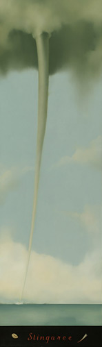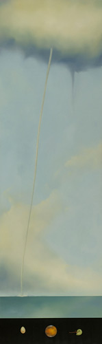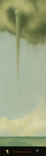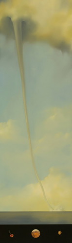 The waterspouts of Spin-o-rama have borders that contain diverse natural objects and phenomena, from unicellular organisms to distant planets. These large-format paintings offer contemplation on the interconnection of nature's forms and rhythms, and reveal the unexpected grace found in elements often considered menacing or lacking inherent beauty.