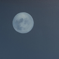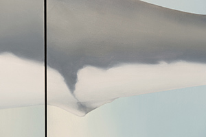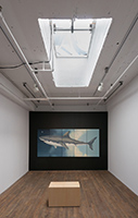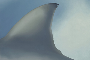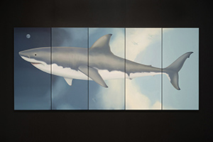 The painting, done in oil on wood, measures approximately 4.5 x 10 feet (143 x 346 cm). Its panels are rendered to suggest the passage from day to night. A great white shark crosses the panels from right to left. Several strange shapes – shark eggs – float at the midpoint. The shark’s gaze, ancient and all knowing, seems to follow us around the room. The wall behind the painting is deep black. A bench for contemplation is placed in front of the work. A traditional gospel song, triggered by a motion sensor, fades in as the viewer enters the room, evoking an atmosphere of compassion and a sentiment of loss.